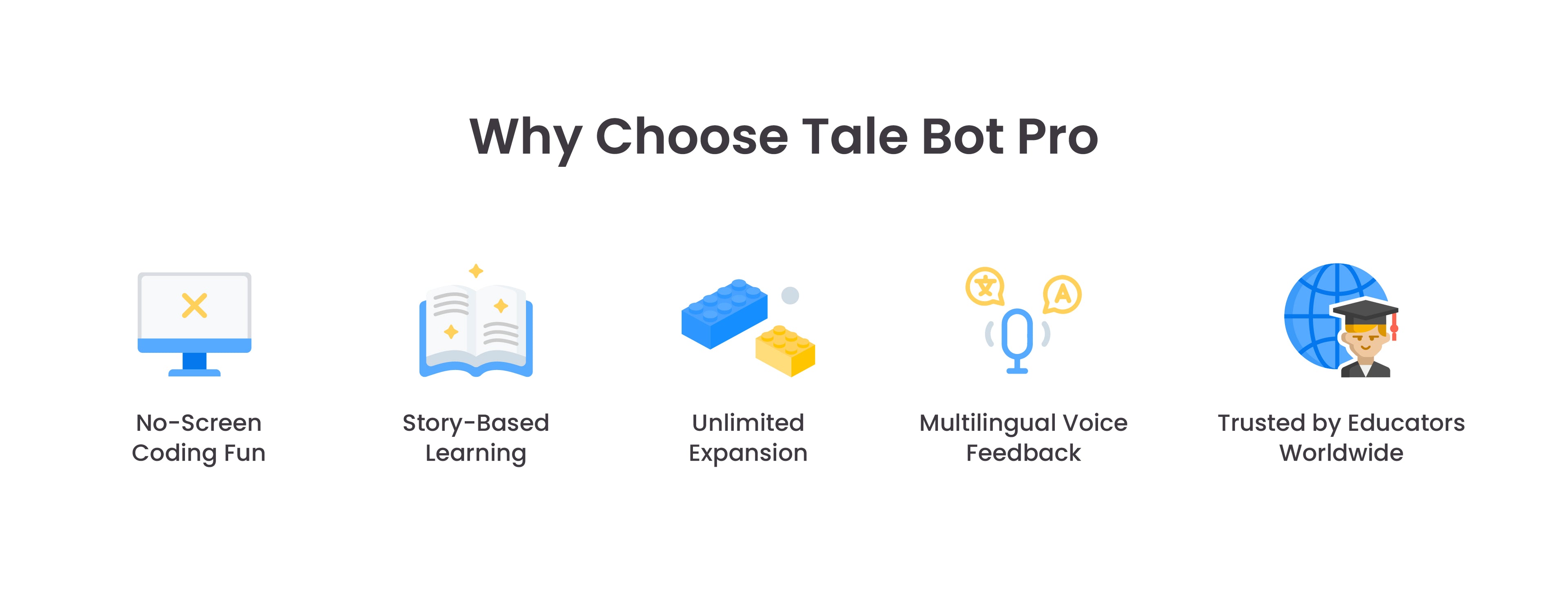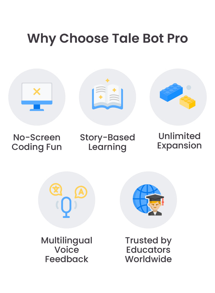 Tale-Bot Pro convierte la programación en una aventura cautivadora, empoderando a los niños para que aprendan los fundamentos de la programación mientras se divierten.